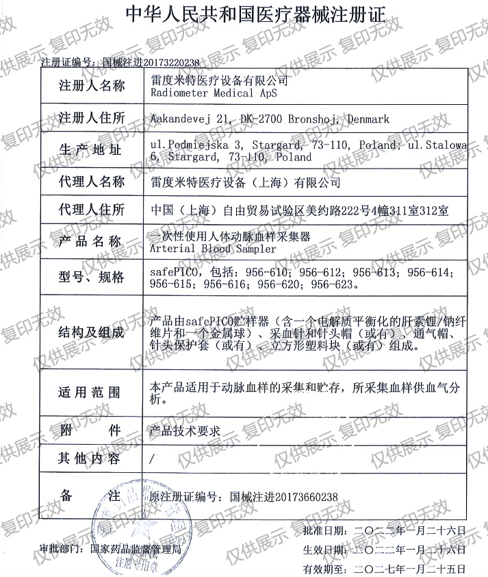 雷度safePICO一次性使用人體動脈血樣采集器